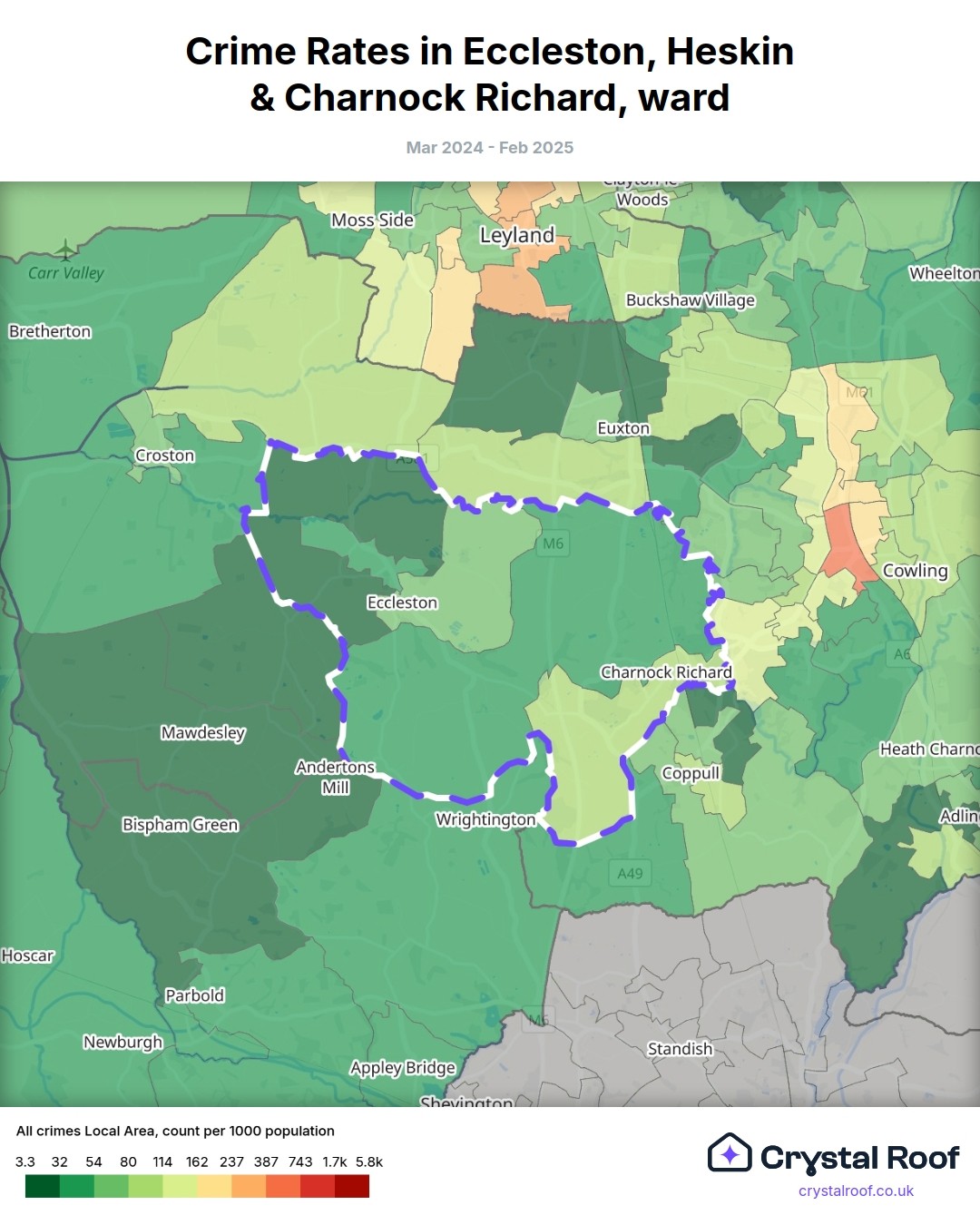 Eccleston, Heskin & Charnock Richard, (ward) includes areas with the following crime ratings (see map):