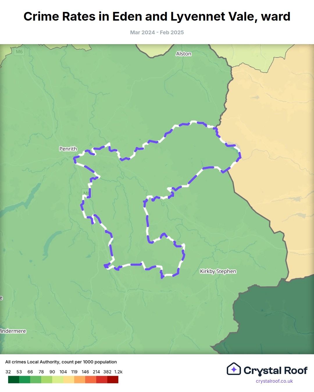 Eden and Lyvennet Vale (ward) is located within Westmorland and Furness (borough). Annual total crime rate in Westmorland and Furness (borough) is 42.6 crimes per thousand resident population, which can be rated as 1 out of 10 or low crime level compared to other local authority districts in England and Wales.