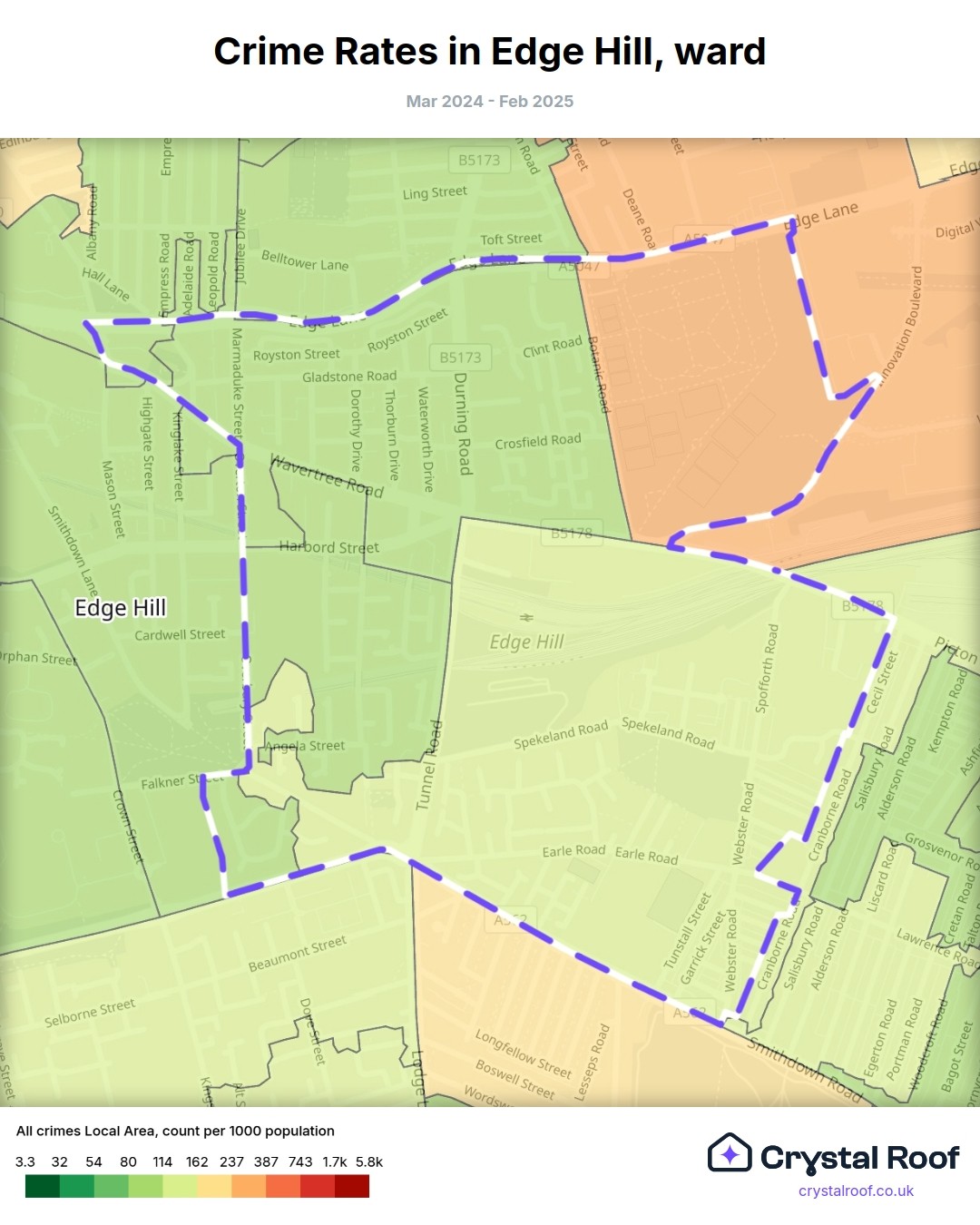 Edge Hill, (ward) includes areas with the following crime ratings (see map):