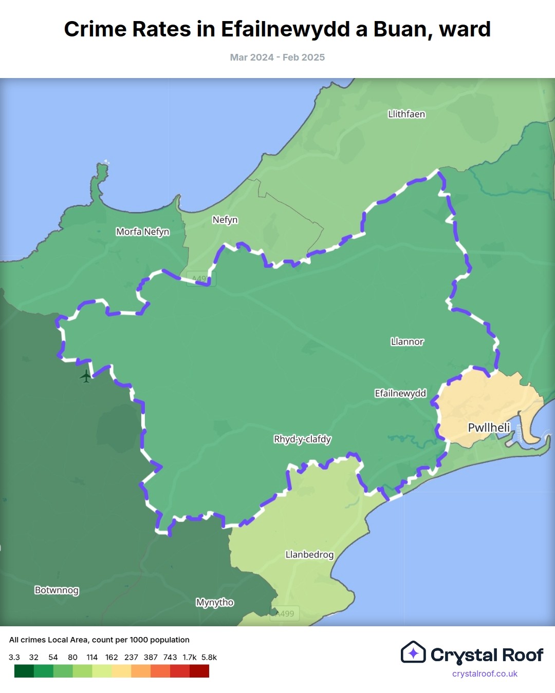 Efailnewydd a Buan, (ward) includes areas with the following crime ratings (see map):