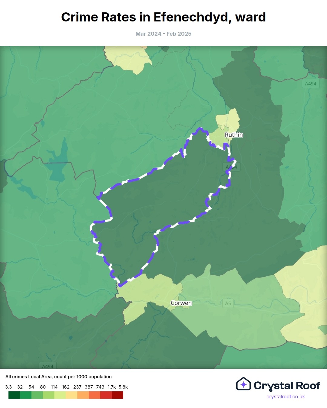 Efenechdyd (ward) is located within Denbighshire (borough). Annual total crime rate in Denbighshire (borough) is 116 crimes per thousand resident population, which can be rated as 6 out of 10 or medium crime level compared to other local authority districts in England and Wales.