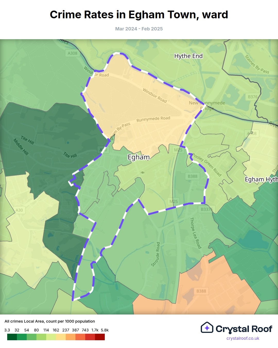 Egham Town, (ward) includes areas with the following crime ratings (see map):