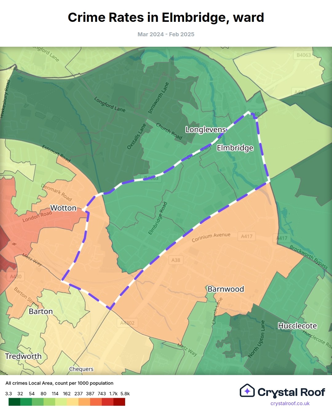 Elmbridge, (ward) includes areas with the following crime ratings (see map):