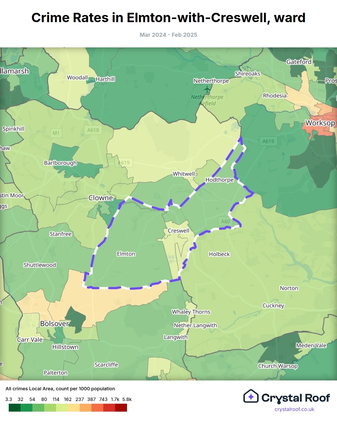 Elmton-with-Creswell, (ward) includes areas with the following crime ratings (see map):