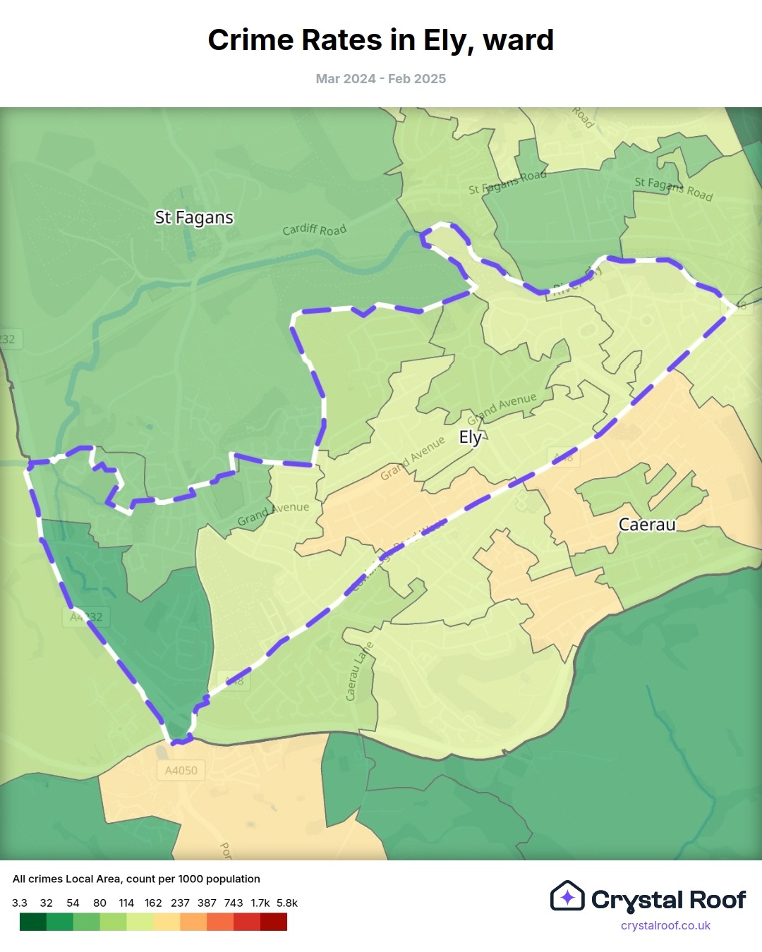 Ely, (ward) includes areas with the following crime ratings (see map):