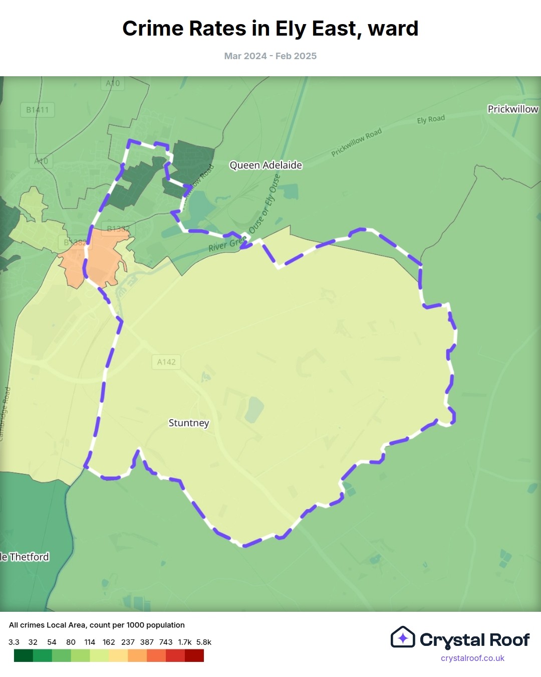 Ely East (ward) is located within East Cambridgeshire (borough). Annual total crime rate in East Cambridgeshire (borough) is 58.5 crimes per thousand resident population, which can be rated as 2 out of 10 or low crime level compared to other local authority districts in England and Wales.