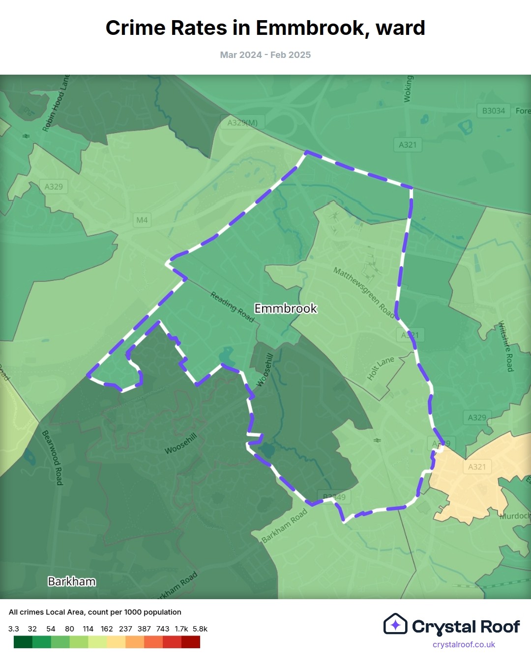 Emmbrook, (ward) includes areas with the following crime ratings (see map):
