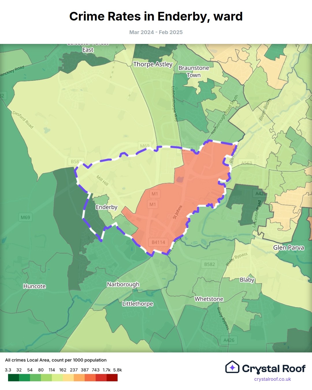 Enderby, (ward) includes areas with the following crime ratings (see map):