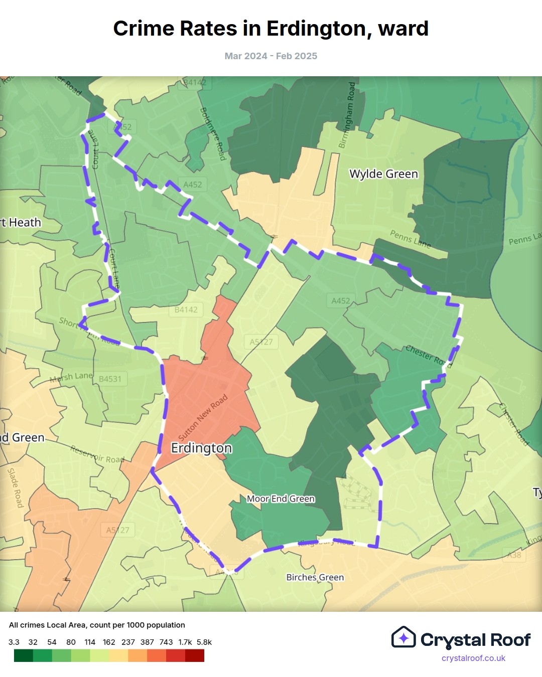 Erdington, (ward) includes areas with the following crime ratings (see map):