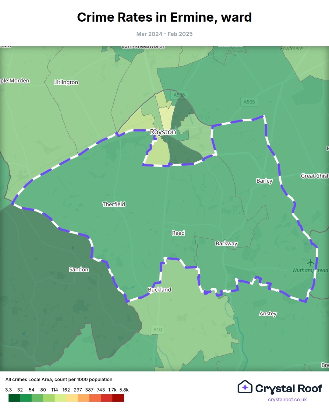 Ermine (ward) is located within North Hertfordshire (borough). Annual total crime rate in North Hertfordshire (borough) is 68.9 crimes per thousand resident population, which can be rated as 2 out of 10 or low crime level compared to other local authority districts in England and Wales.