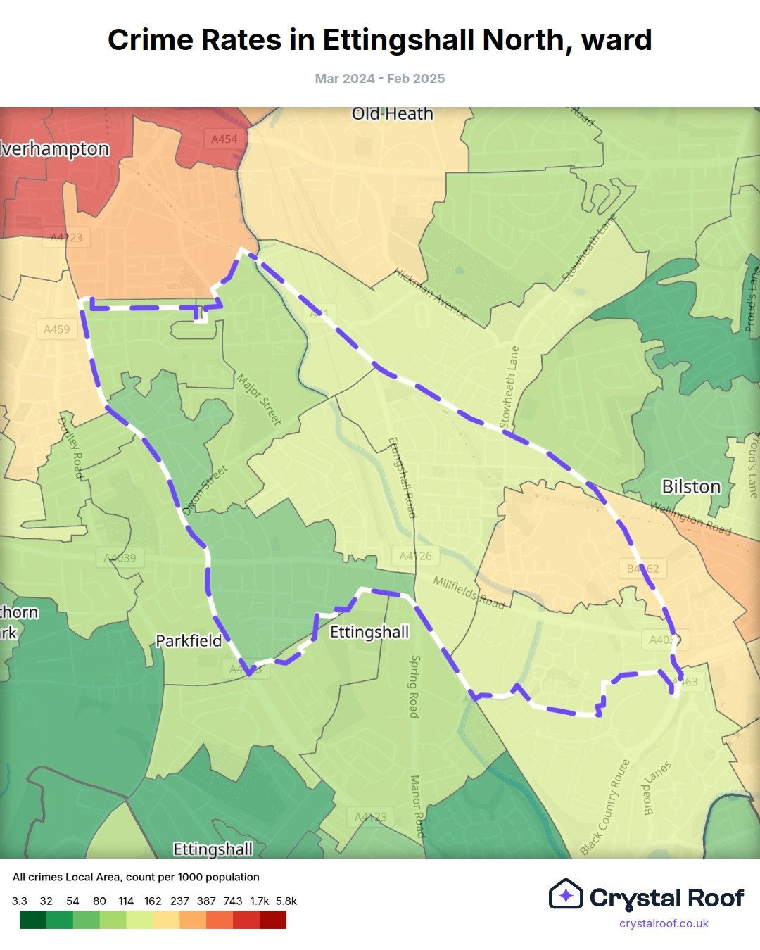 The figures in grey indicate the relative ratings of Ettingshall North (ward) for a specific crime type compared to other wards in England and Wales.