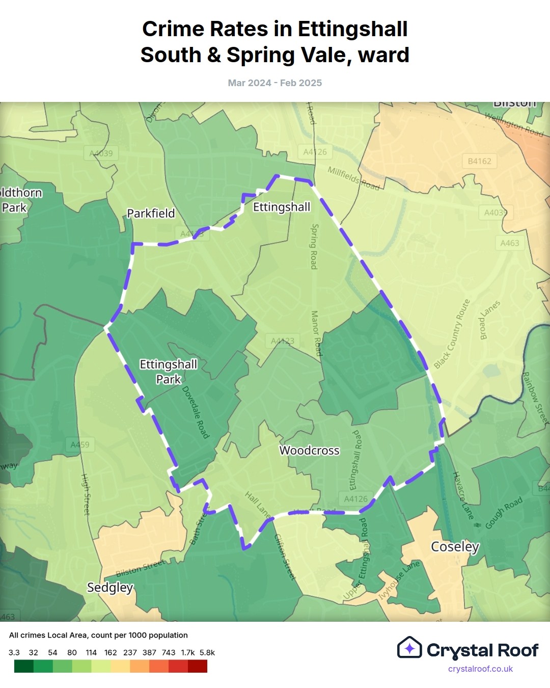 The figures in grey indicate the relative ratings of Ettingshall South & Spring Vale (ward) for a specific crime type compared to other wards in England and Wales.