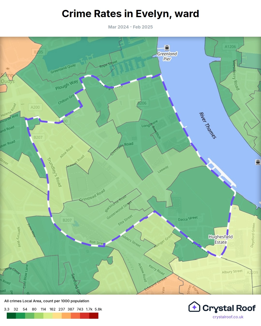 Evelyn (ward) is located within Lewisham (borough). Annual total crime rate in Lewisham (borough) is 120 crimes per thousand resident population, which can be rated as 6 out of 10 or medium crime level compared to other local authority districts in England and Wales.