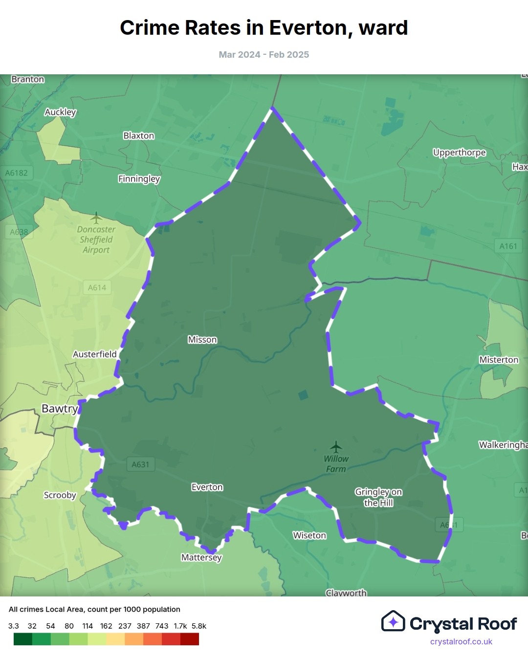 Everton (ward) is located within Bassetlaw (borough). Annual total crime rate in Bassetlaw (borough) is 97.4 crimes per thousand resident population, which can be rated as 4 out of 10 or low crime level compared to other local authority districts in England and Wales.