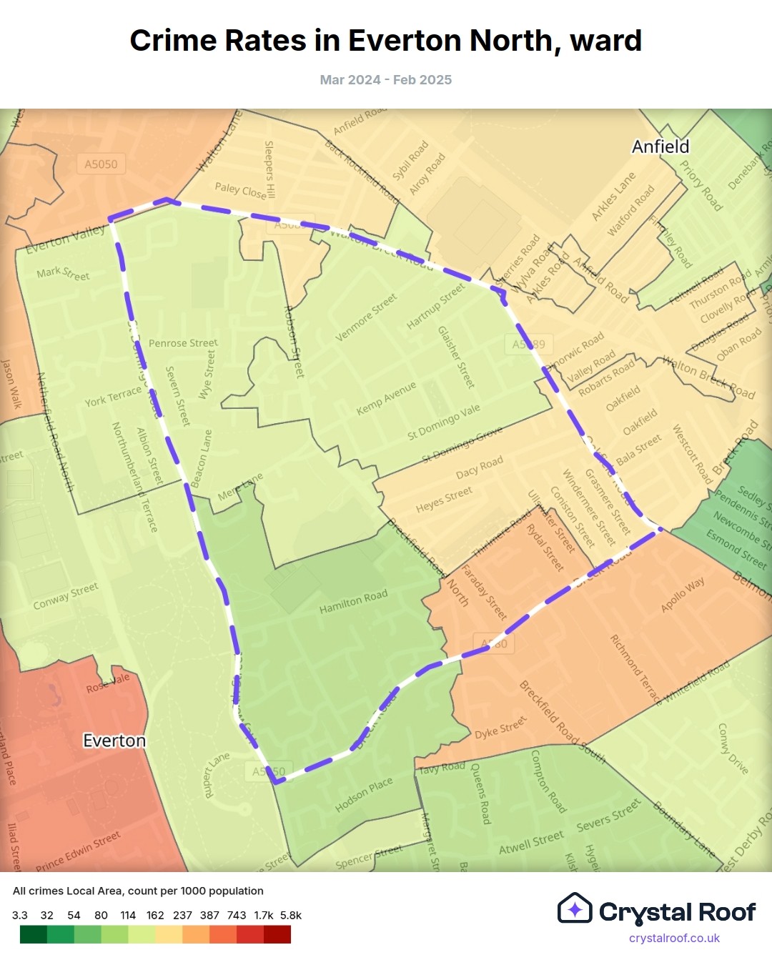 Everton North, (ward) includes areas with the following crime ratings (see map):