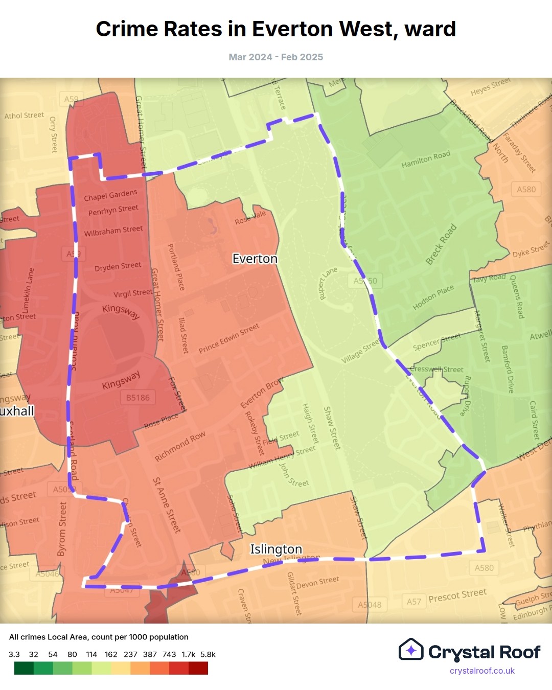 Everton West, (ward) includes areas with the following crime ratings (see map):