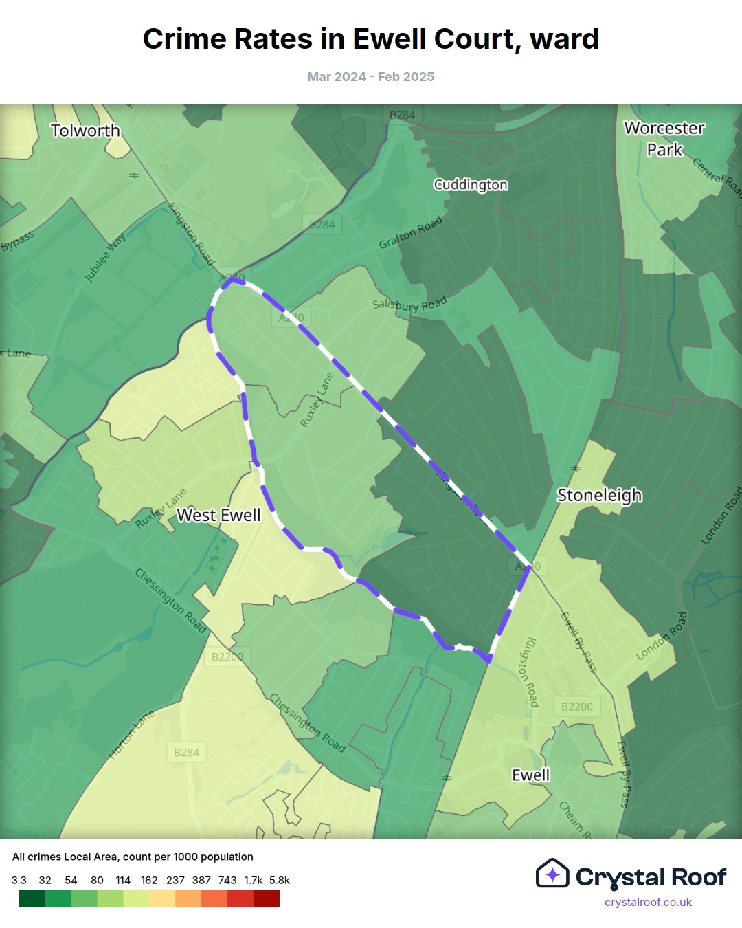Ewell Court, (ward) includes areas with the following crime ratings (see map):
