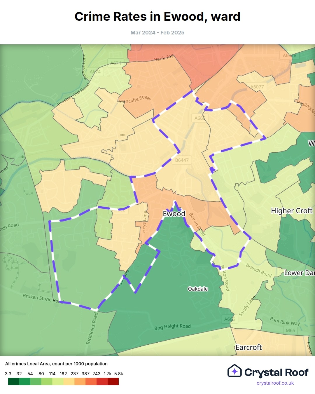 Ewood, (ward) includes areas with the following crime ratings (see map):
