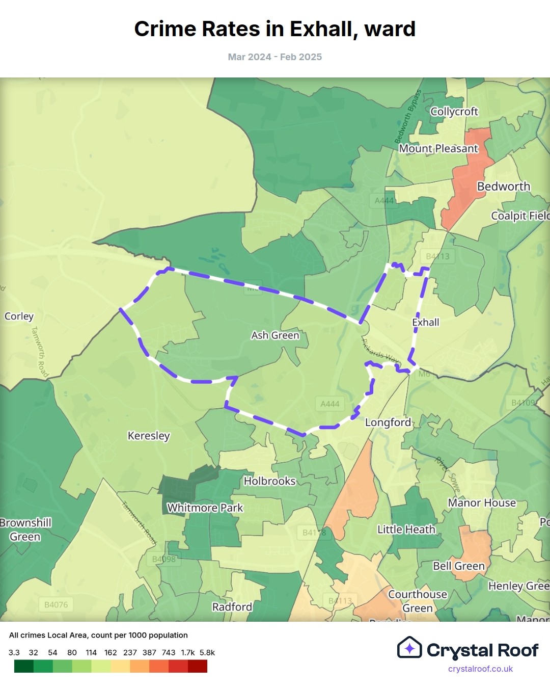 Exhall, (ward) includes areas with the following crime ratings (see map):