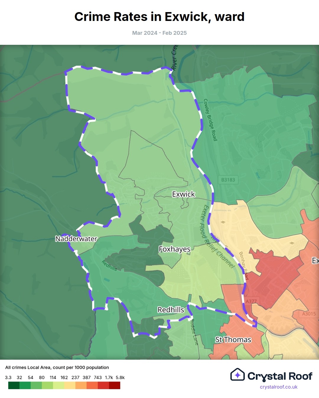Exwick, (ward) includes areas with the following crime ratings (see map):