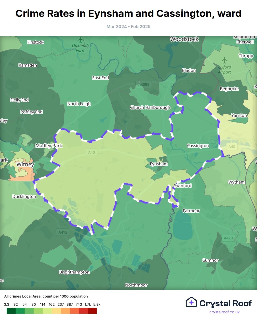 Eynsham and Cassington, (ward) includes areas with the following crime ratings (see map):