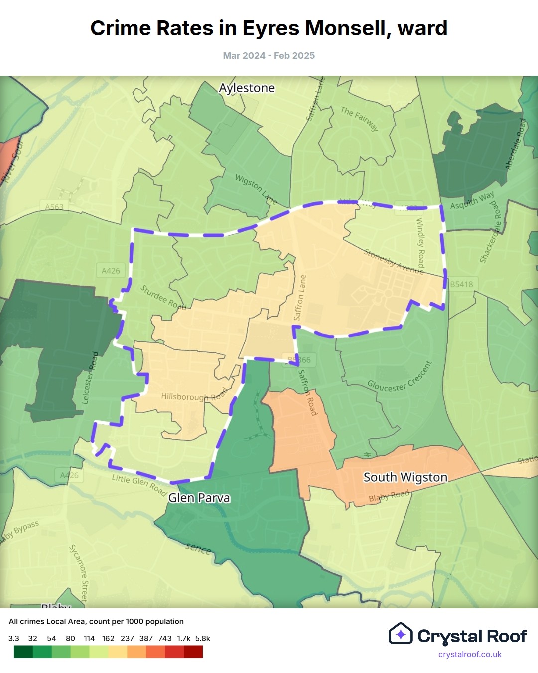 Eyres Monsell, (ward) includes areas with the following crime ratings (see map):