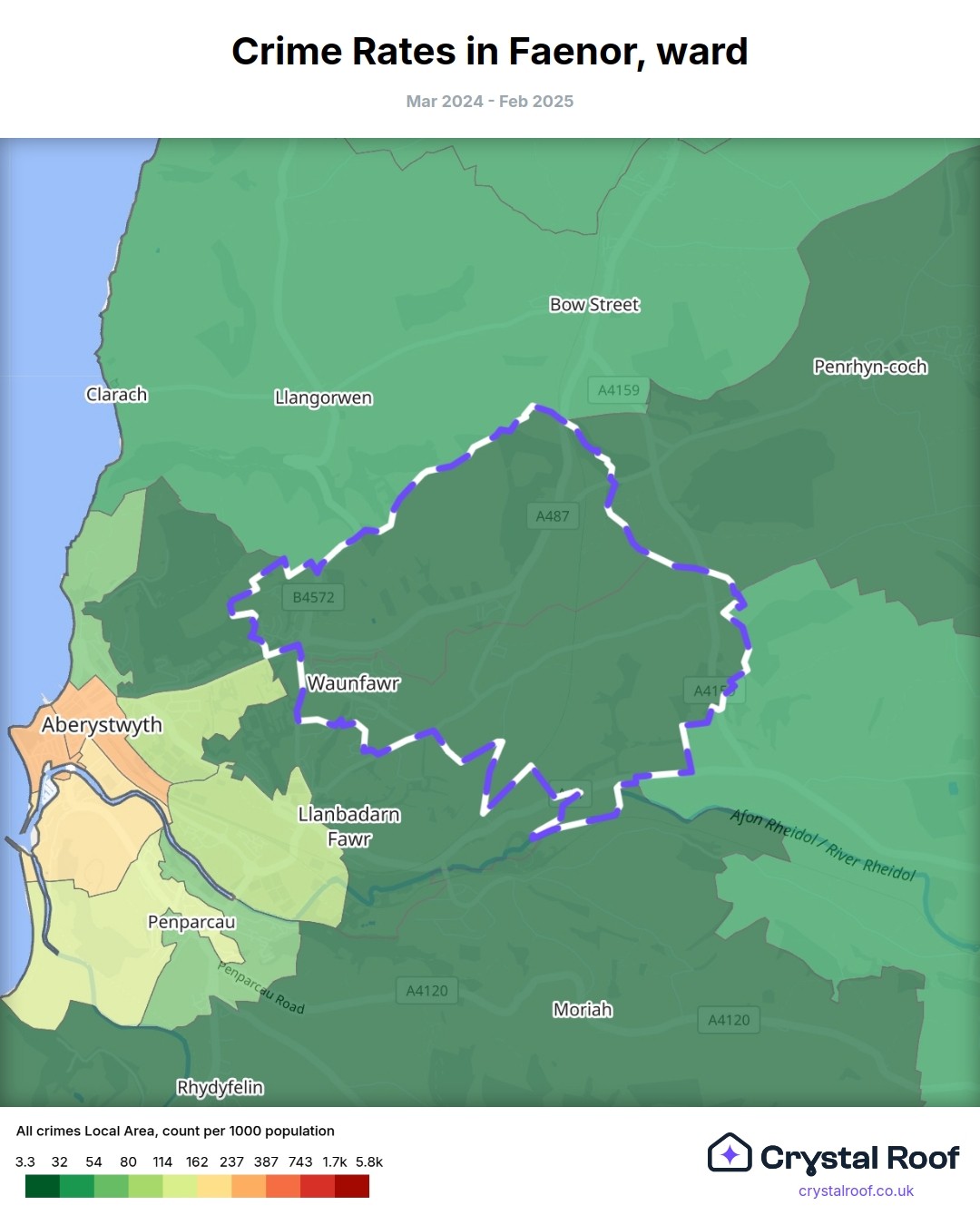Faenor (ward) is located within Ceredigion (borough). Annual total crime rate in Ceredigion (borough) is 68.5 crimes per thousand resident population, which can be rated as 2 out of 10 or low crime level compared to other local authority districts in England and Wales.