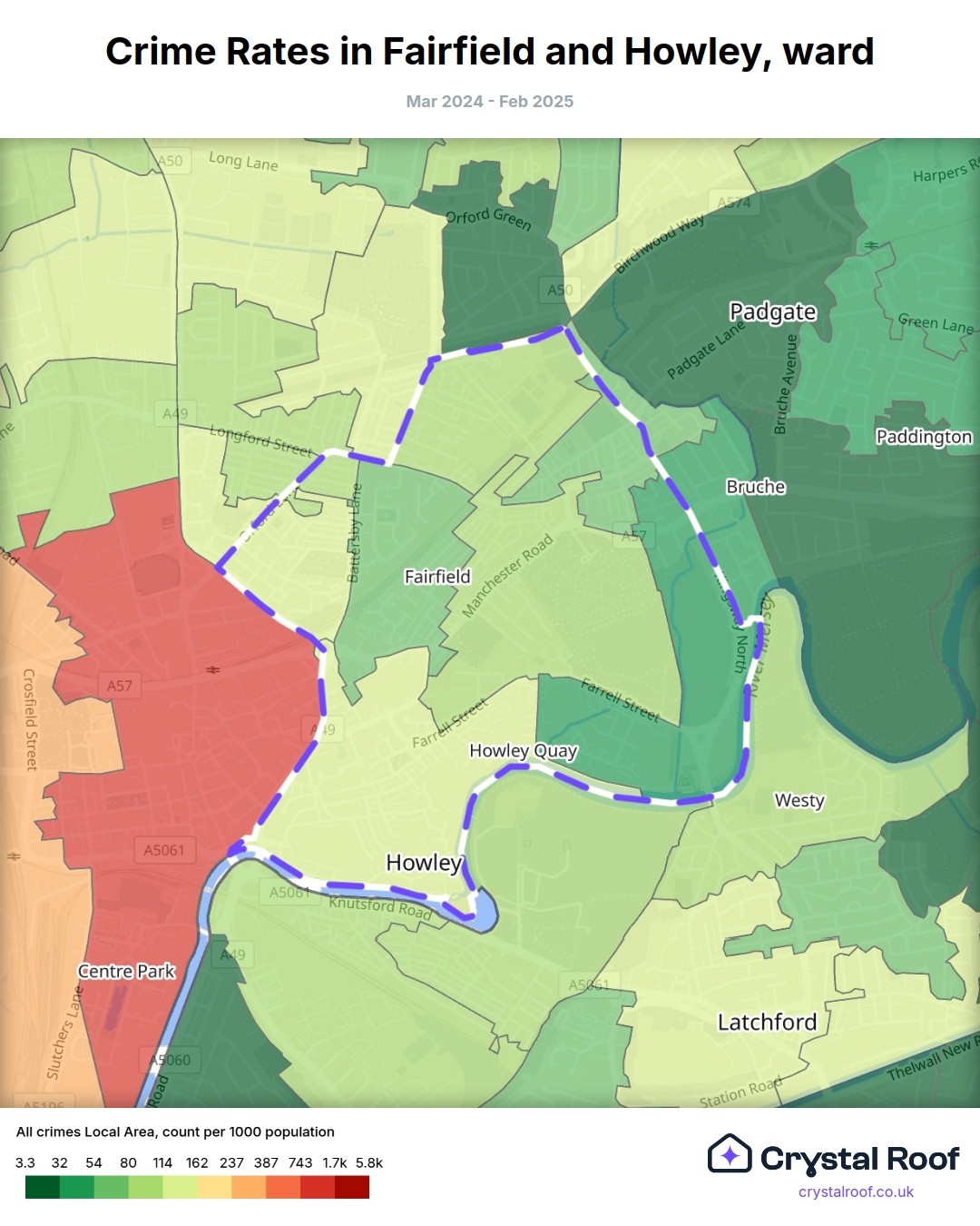 The figures in grey indicate the relative ratings of Fairfield and Howley (ward) for a specific crime type compared to other wards in England and Wales.