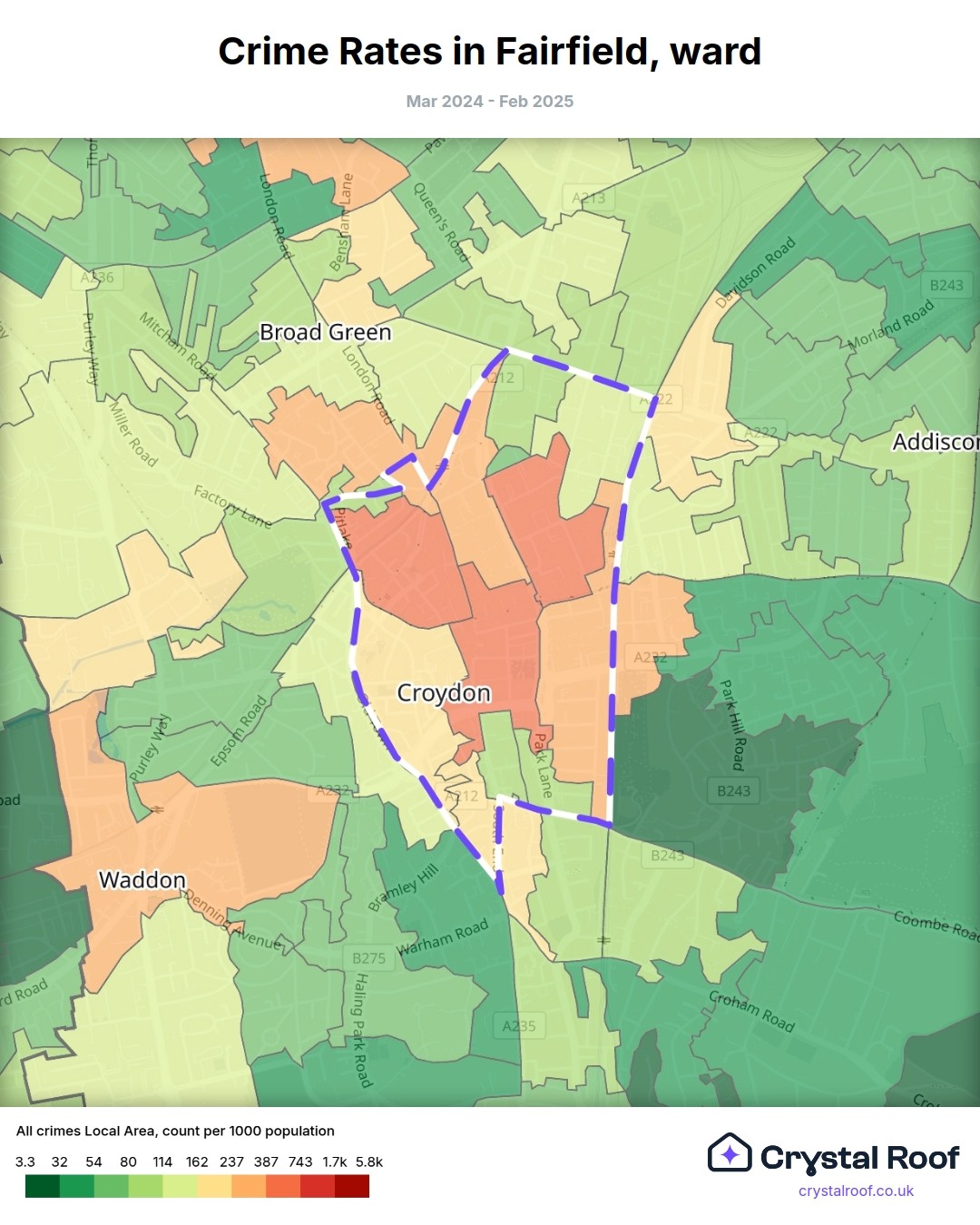 Fairfield (ward) is located within Croydon (borough). Annual total crime rate in Croydon (borough) is 111 crimes per thousand resident population, which can be rated as 5 out of 10 or medium crime level compared to other local authority districts in England and Wales.