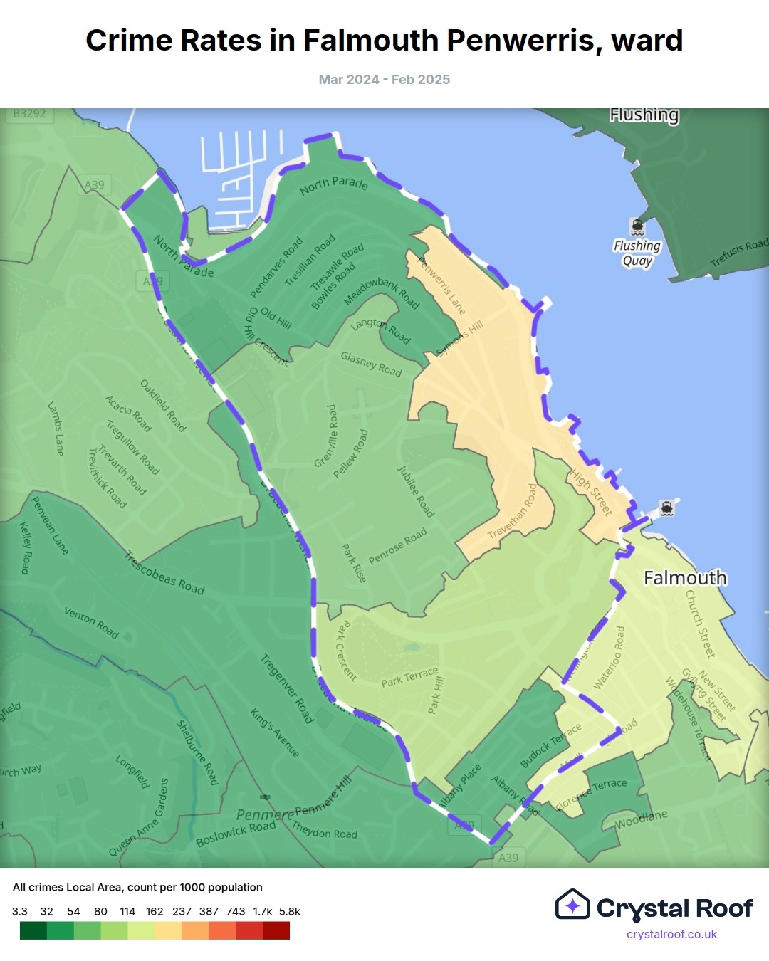 Falmouth Penwerris, (ward) includes areas with the following crime ratings (see map):