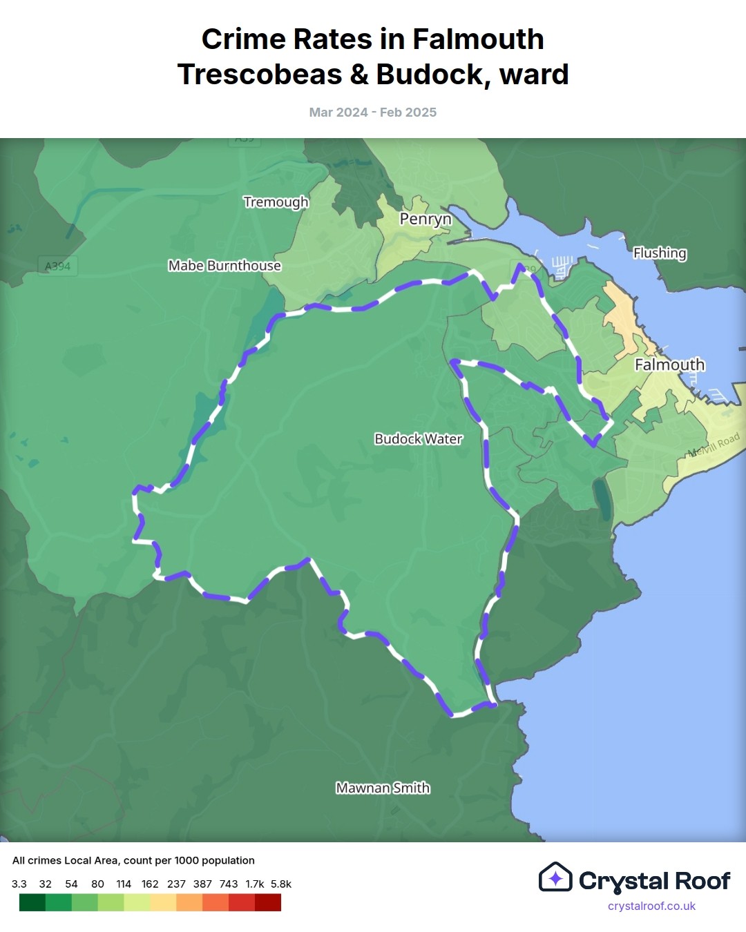 Falmouth Trescobeas & Budock, (ward) includes areas with the following crime ratings (see map):
