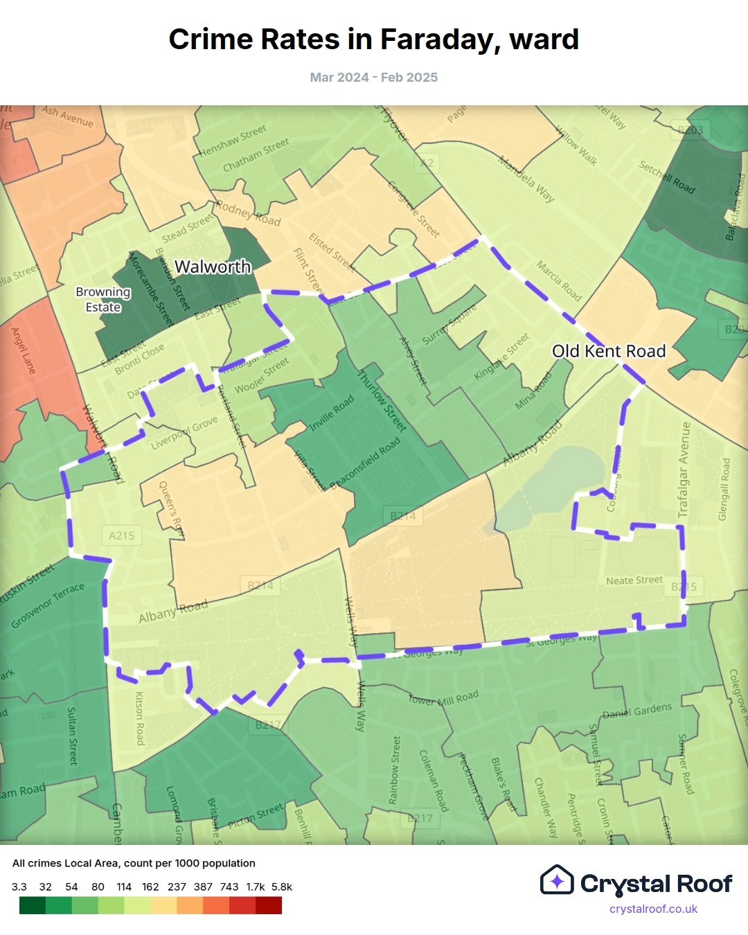 Faraday, (ward) includes areas with the following crime ratings (see map):