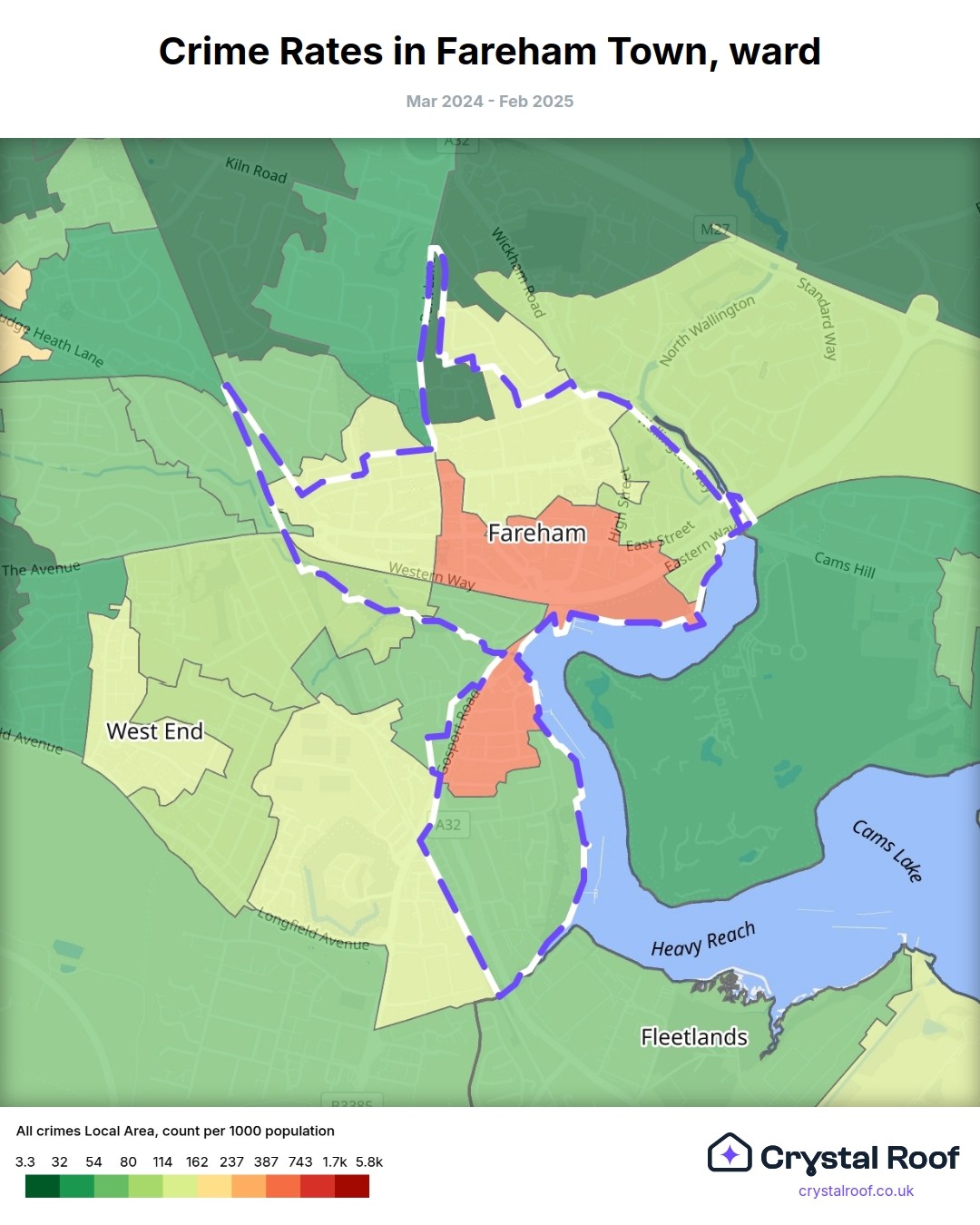 Fareham Town, (ward) includes areas with the following crime ratings (see map):