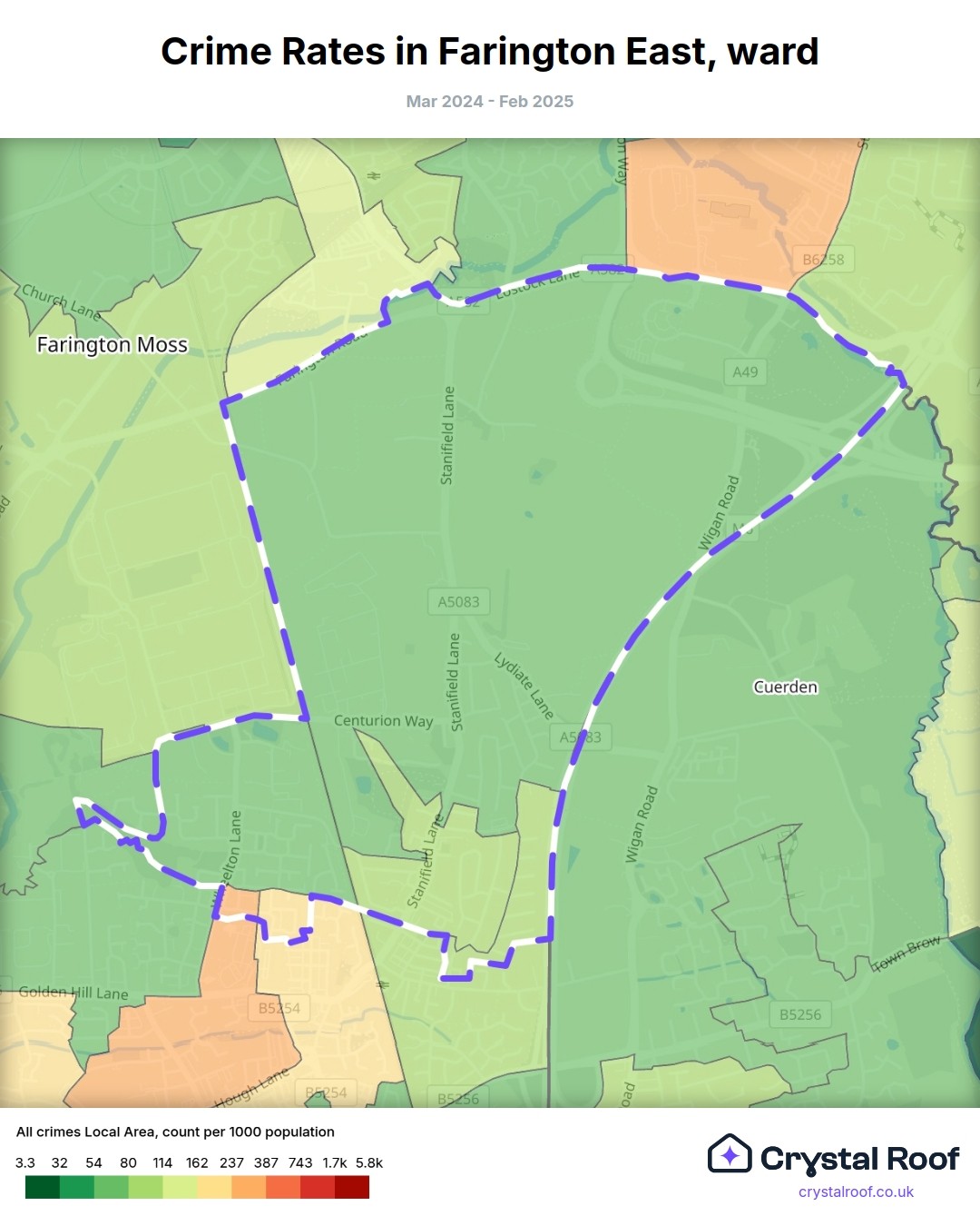 Farington East, (ward) includes areas with the following crime ratings (see map):