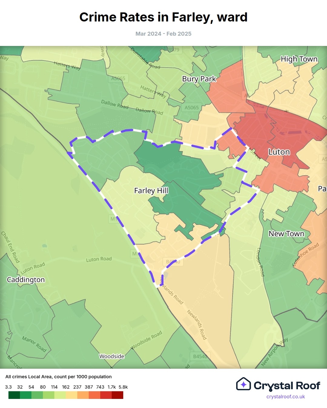 Farley (ward) is located within Luton (borough). Annual total crime rate in Luton (borough) is 101 crimes per thousand resident population, which can be rated as 4 out of 10 or low crime level compared to other local authority districts in England and Wales.