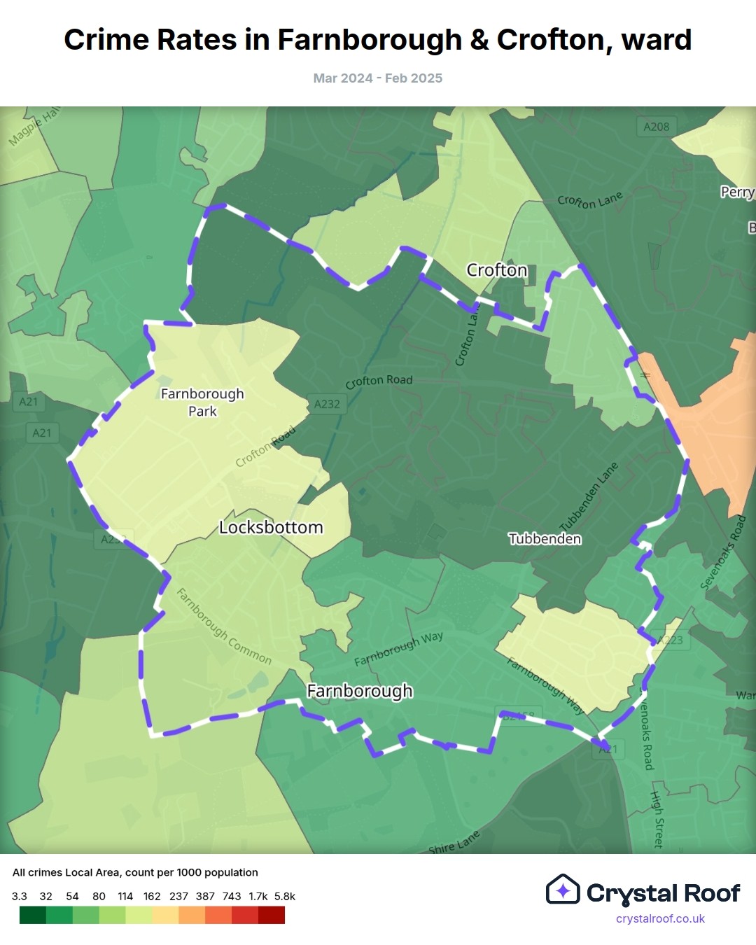 Farnborough & Crofton, (ward) includes areas with the following crime ratings (see map):