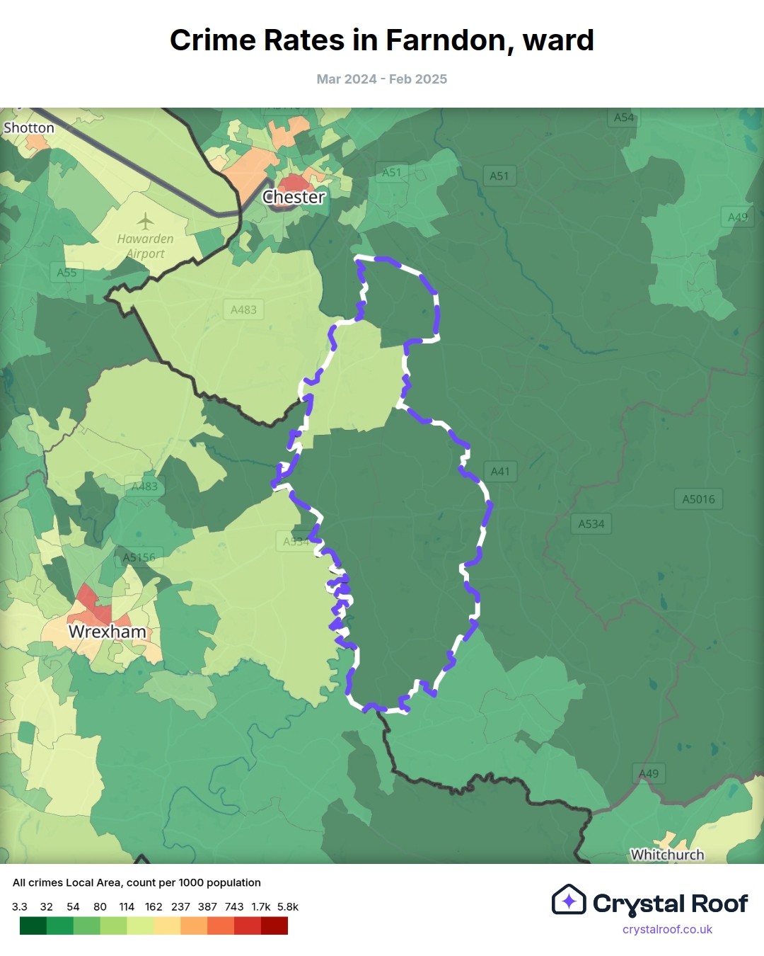 The figures in grey indicate the relative ratings of Farndon (ward) for a specific crime type compared to other wards in England and Wales.