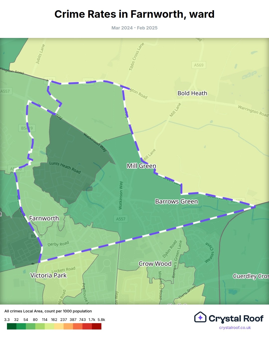 Farnworth, (ward) includes areas with the following crime ratings (see map):