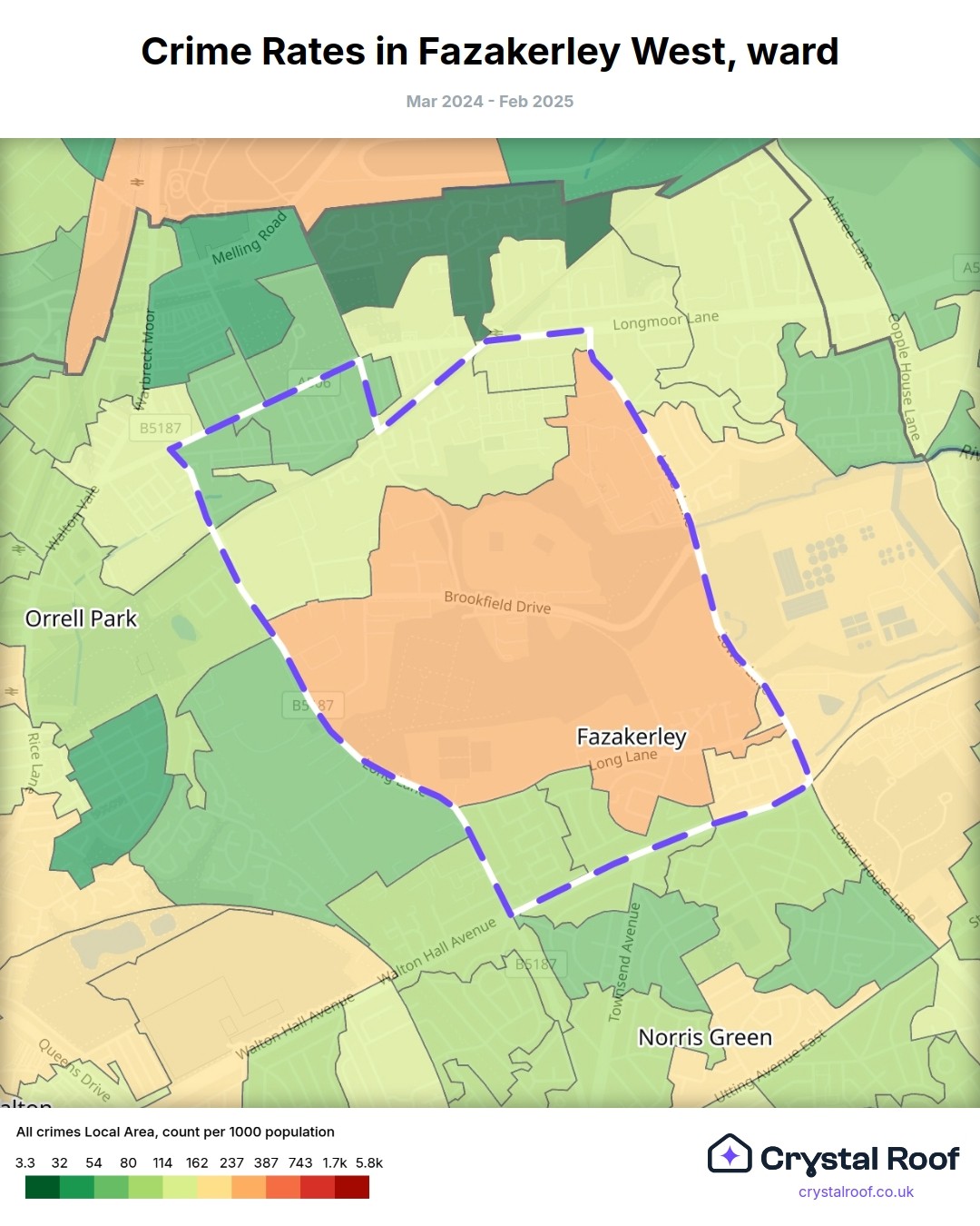 The figures in grey indicate the relative ratings of Fazakerley West (ward) for a specific crime type compared to other wards in England and Wales.