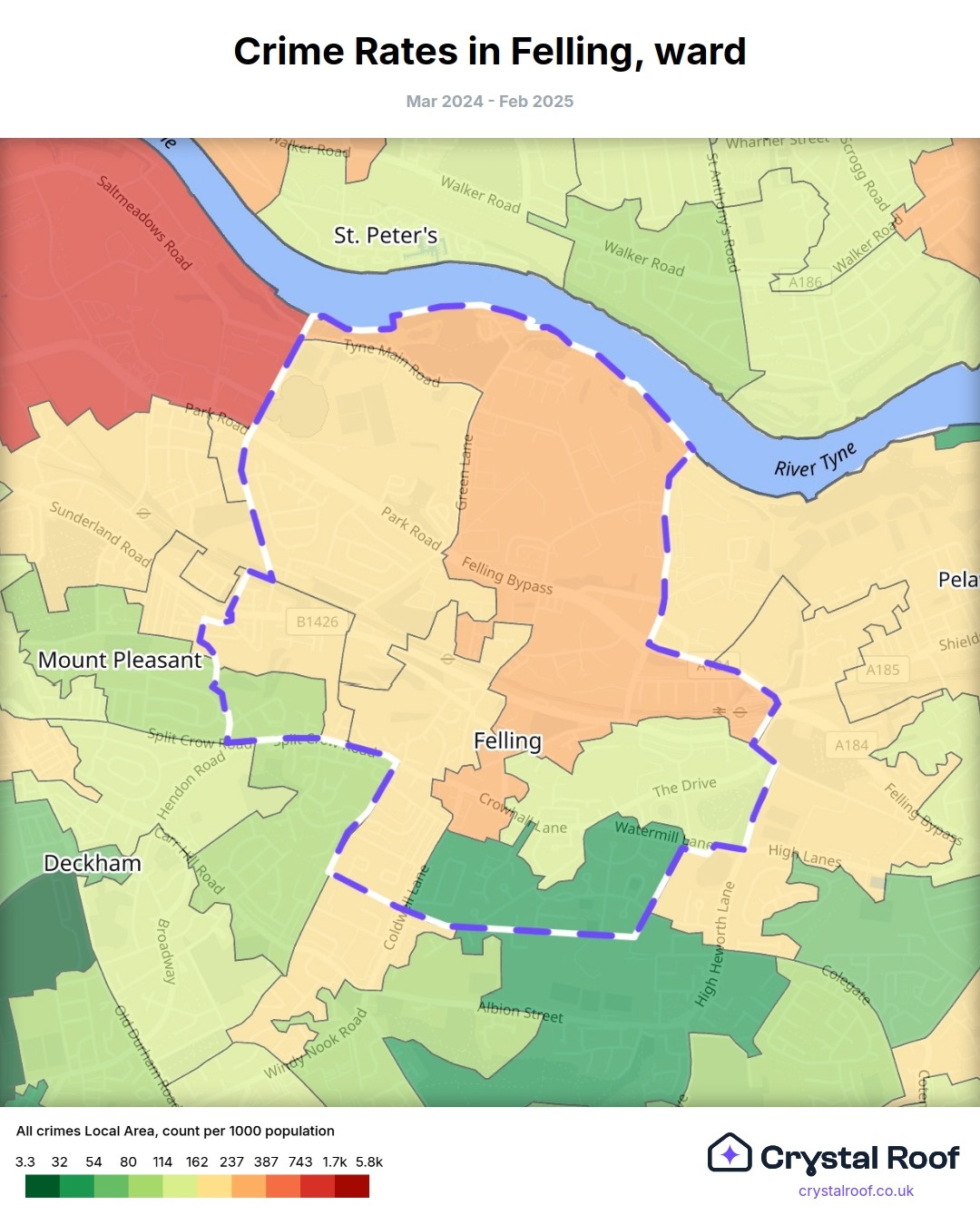 Felling, (ward) includes areas with the following crime ratings (see map):