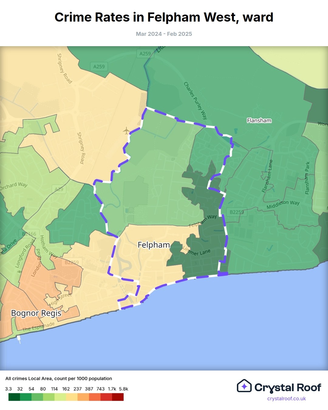 Felpham West, (ward) includes areas with the following crime ratings (see map):