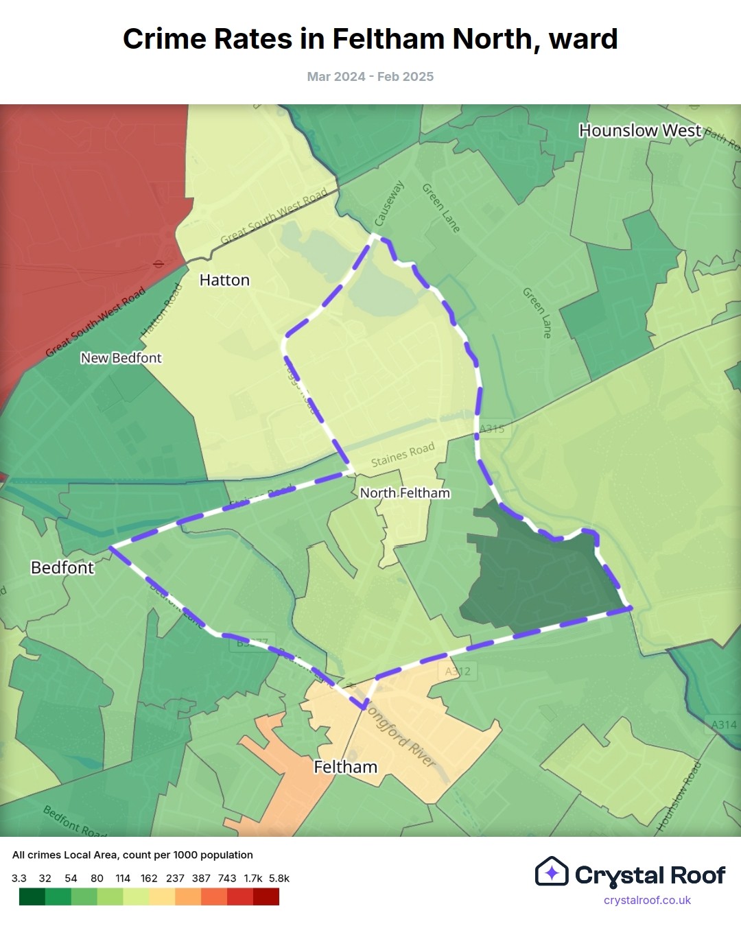 Feltham North, (ward) includes areas with the following crime ratings (see map):