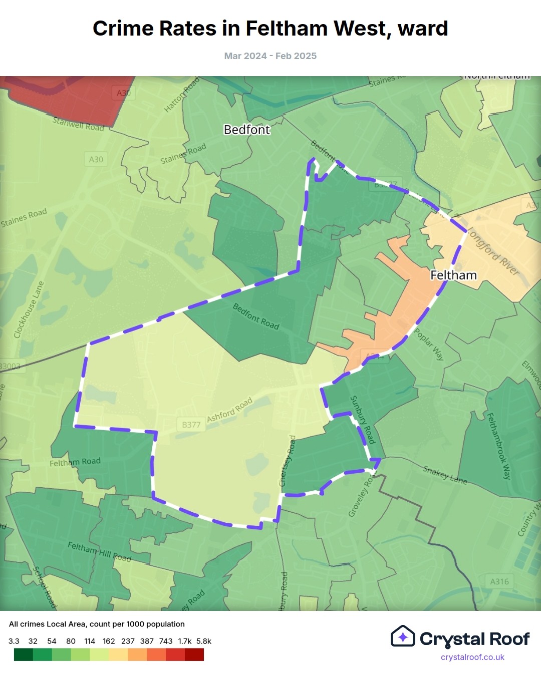 Feltham West, (ward) includes areas with the following crime ratings (see map):