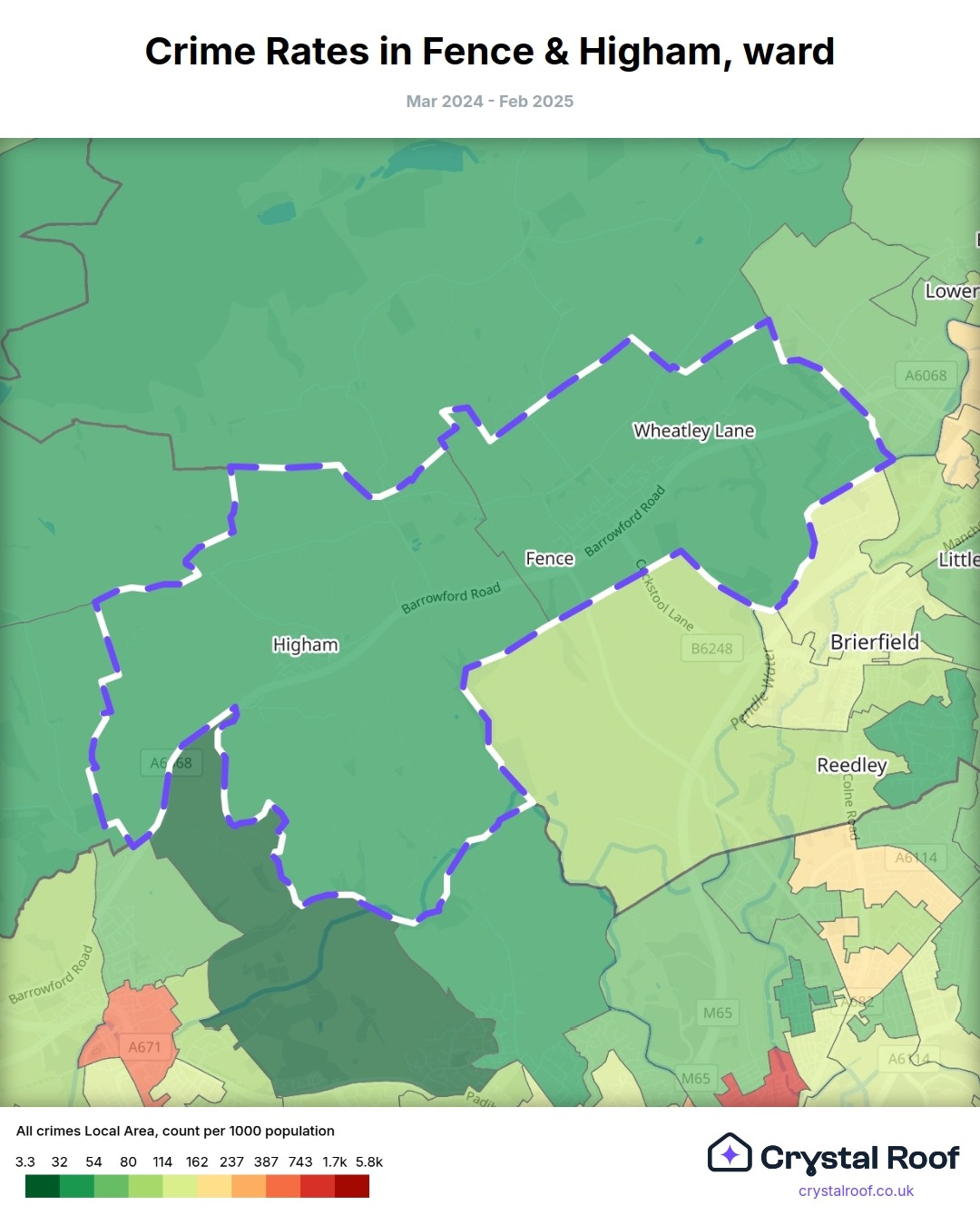 Fence & Higham, (ward) includes areas with the following crime ratings (see map):
