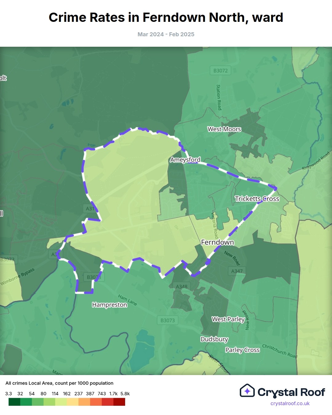 Ferndown North, (ward) includes areas with the following crime ratings (see map):