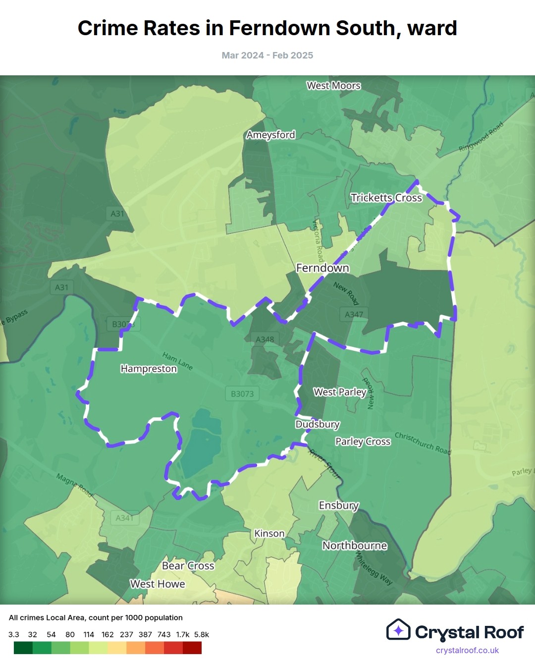 Ferndown South, (ward) includes areas with the following crime ratings (see map):