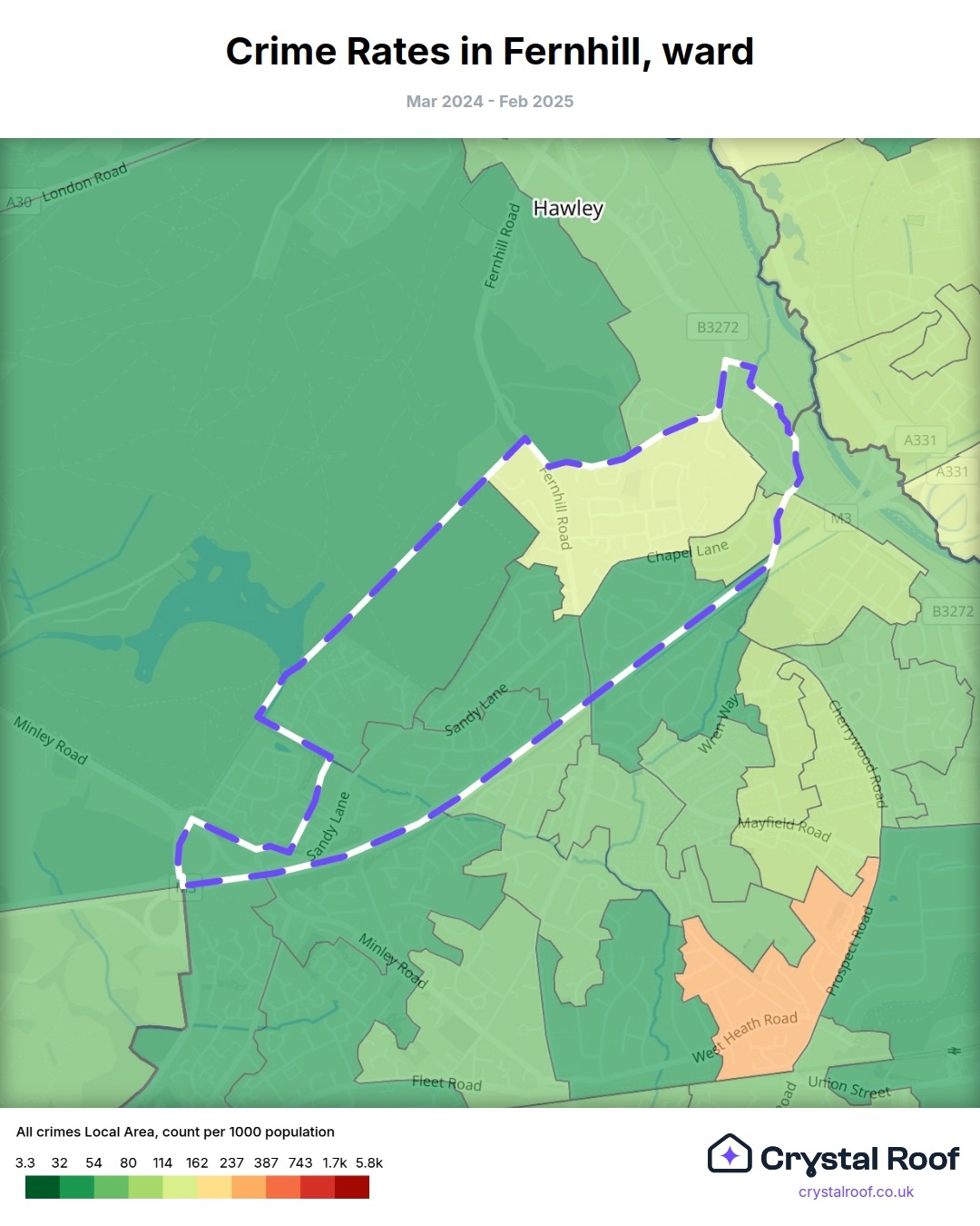 Historical crime rates in Fernhill (ward), Rushmoor (local authority district) and South East (region)