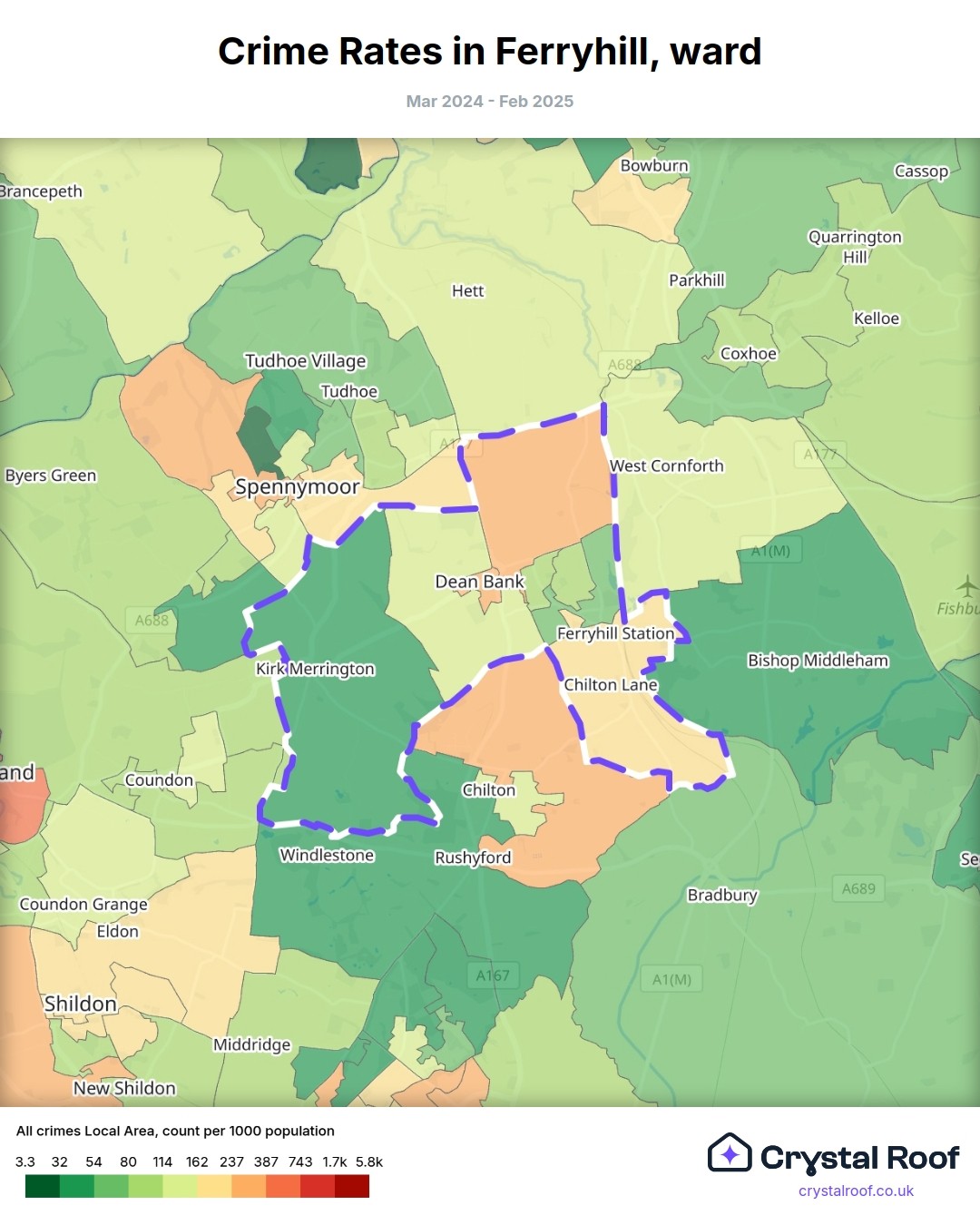 Ferryhill, (ward) includes areas with the following crime ratings (see map):