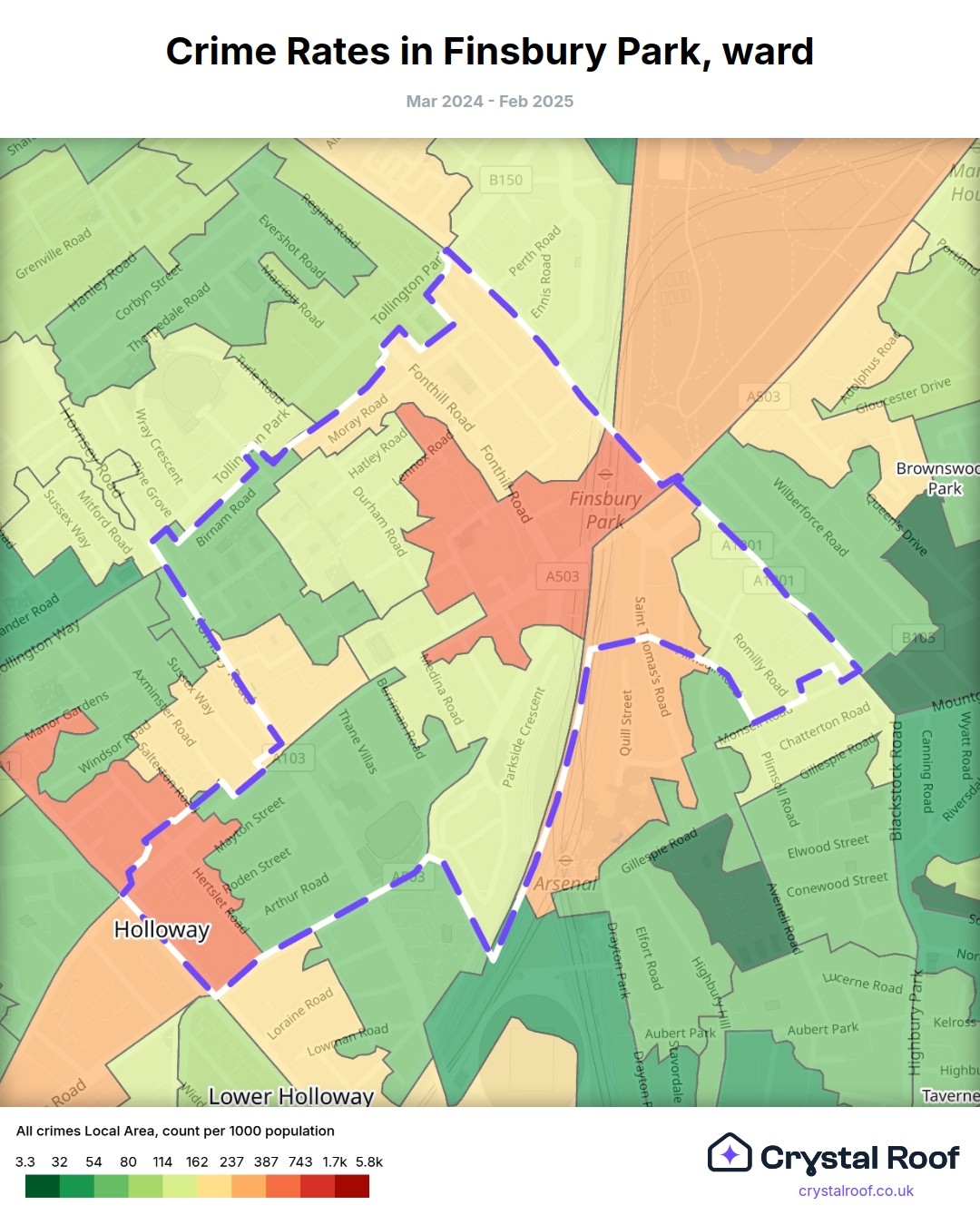 Finsbury Park, (ward) includes areas with the following crime ratings (see map):