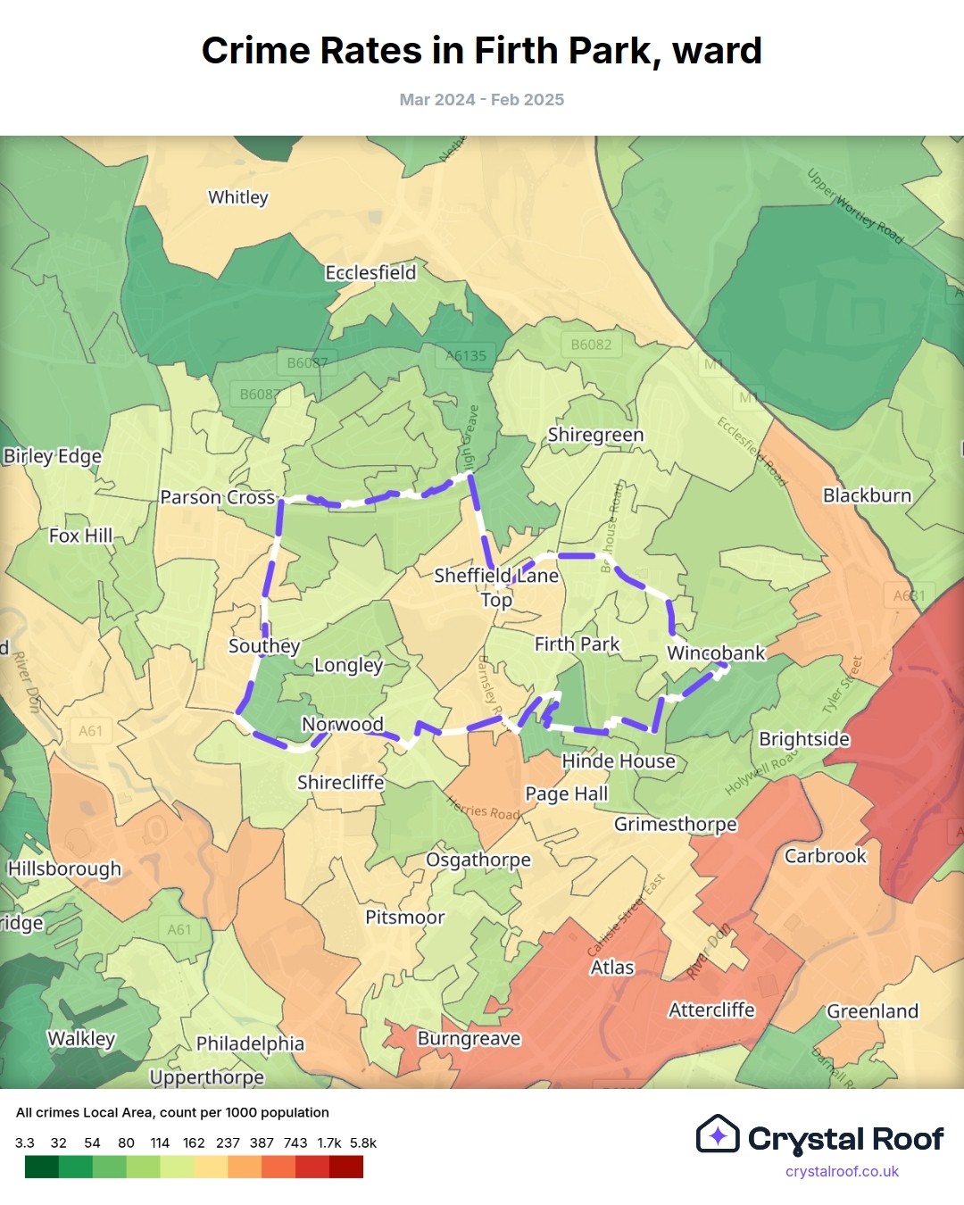 The figures in grey indicate the relative ratings of Firth Park (ward) for a specific crime type compared to other wards in England and Wales.